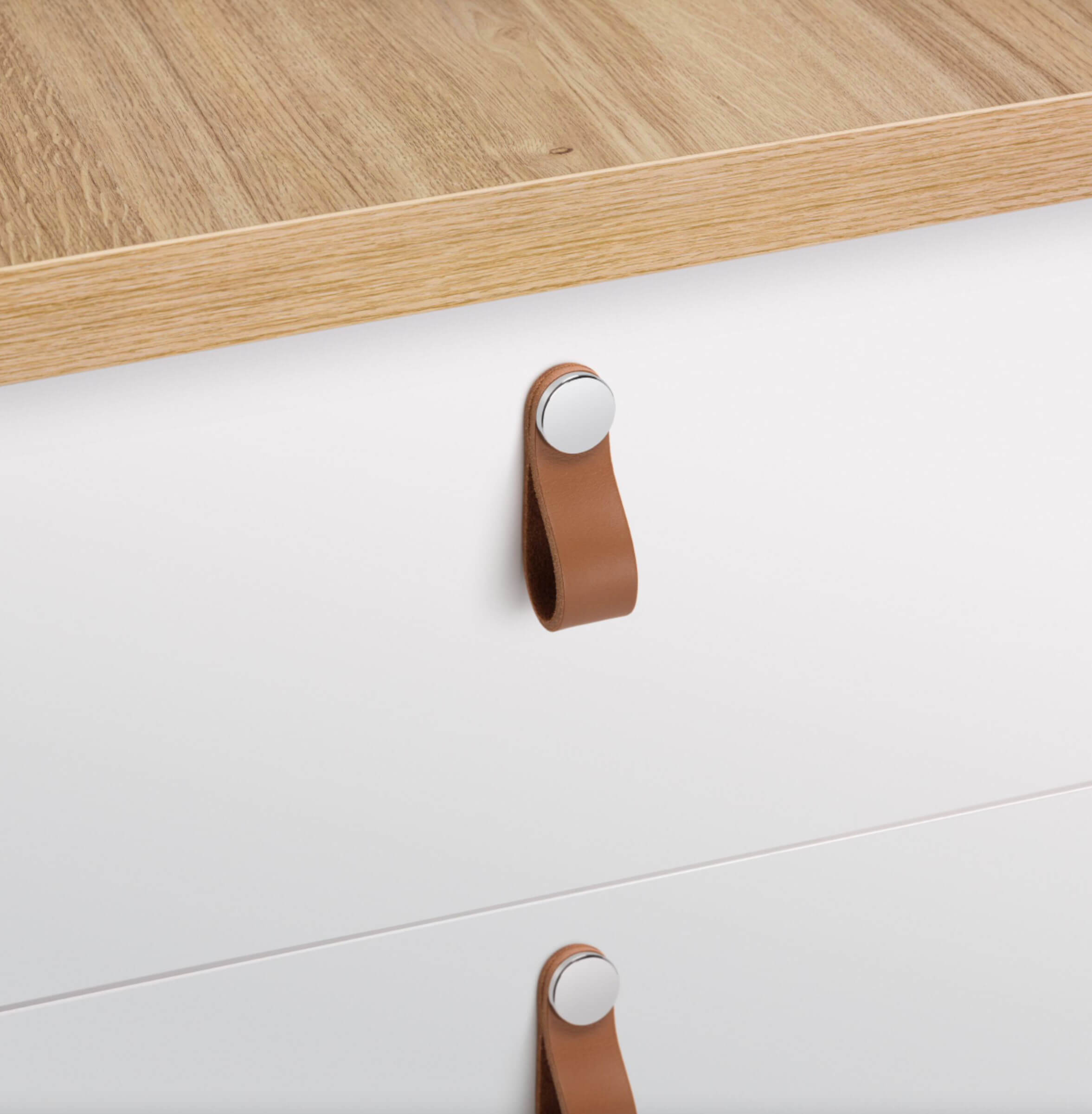 Úchytka FLEXA je vyrobená z vysokokvalitnej kože a každému kusu nábytku, na ktorý sa namontuje, dodá teplý organický nádych.